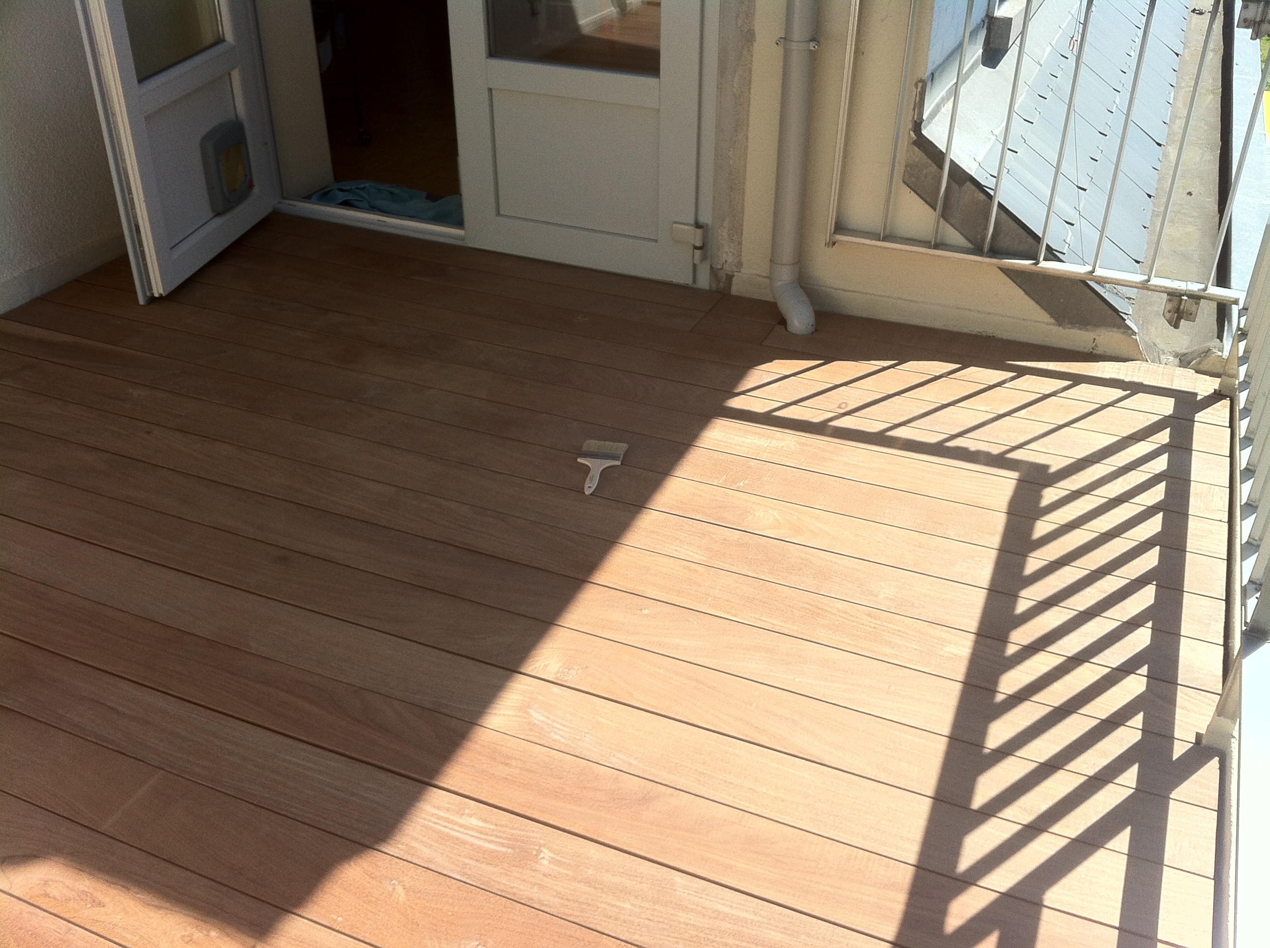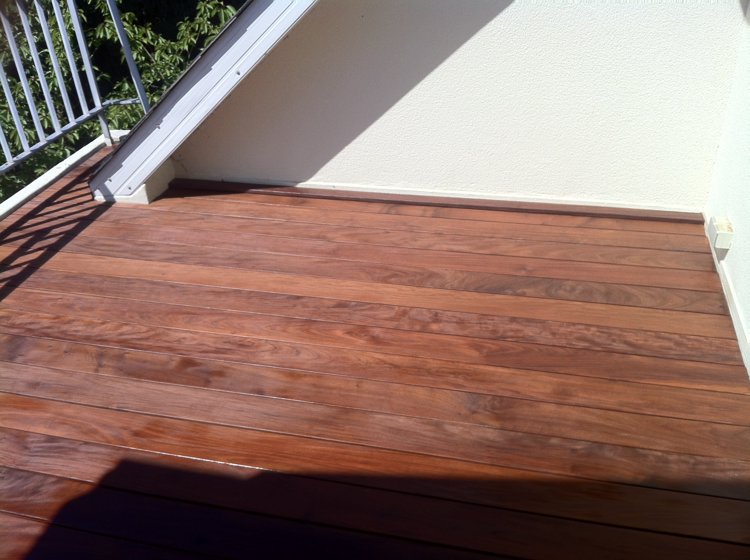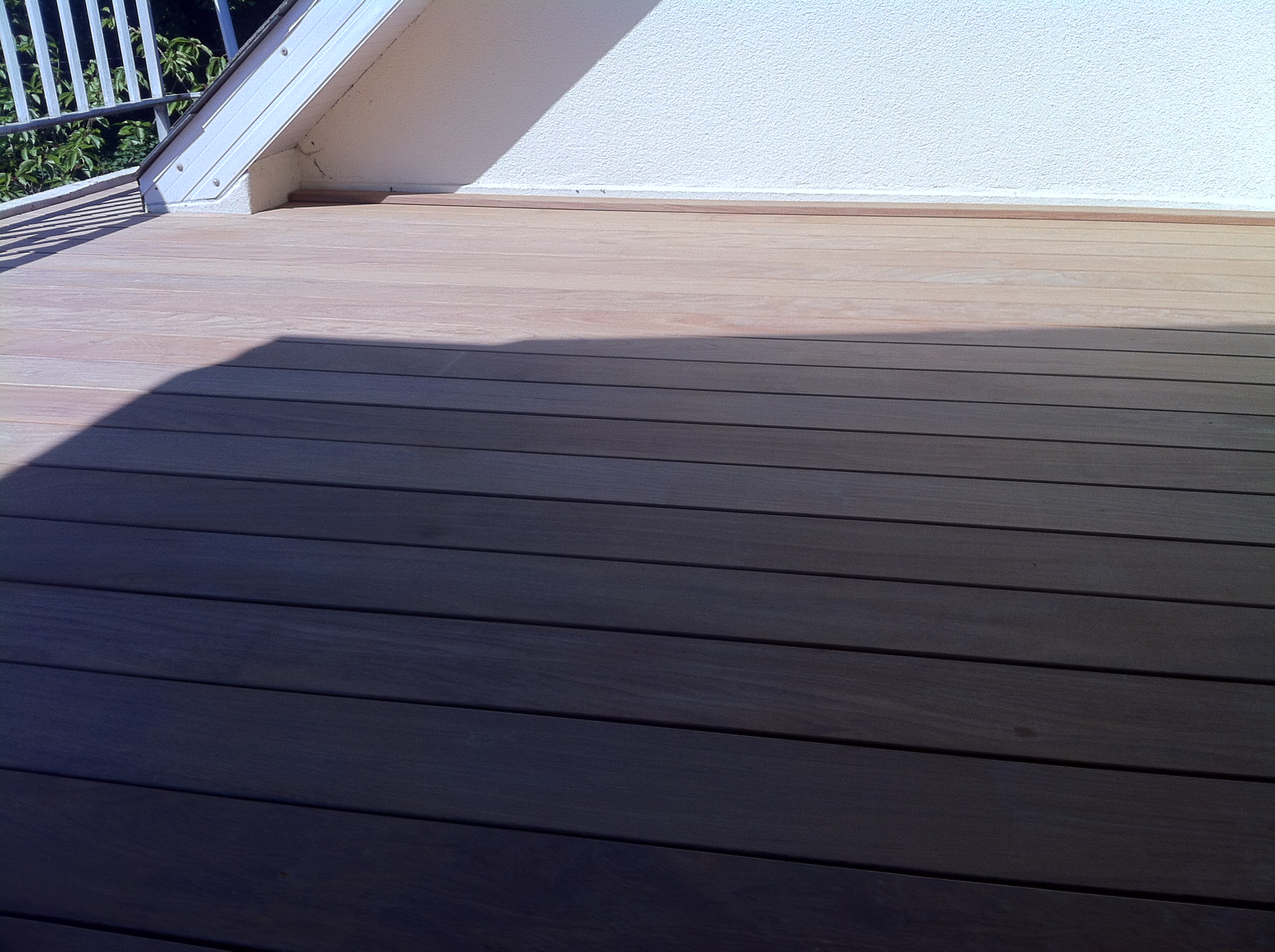 Aménagement d’une terrasse en bois exotique au dessus d’une couche d’étanchéité réalisée en Derbigum.